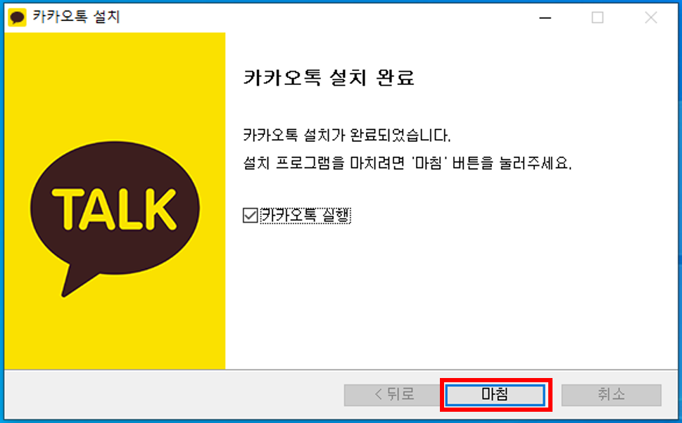 '카카오톡 실행'에 체크가 된 상태에서 '마침'버튼을 클릭하면 최초에 카카오톡이 실행되게 됩니다.