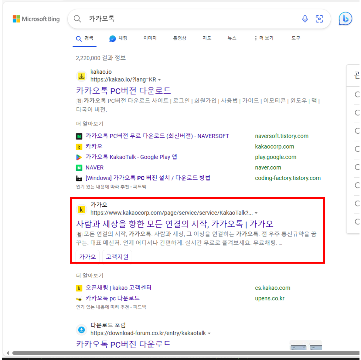 일반적으로 '카카오톡'이라고 검색을 하면 대부분 상단에 표시되는데