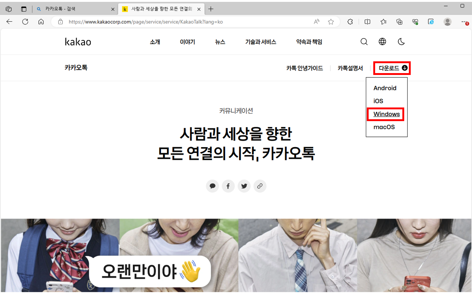위 이미지와 같은 화면이 나오면 맞습니다. 카카오톡 홈페이지로 이동한것이 맞습니다.