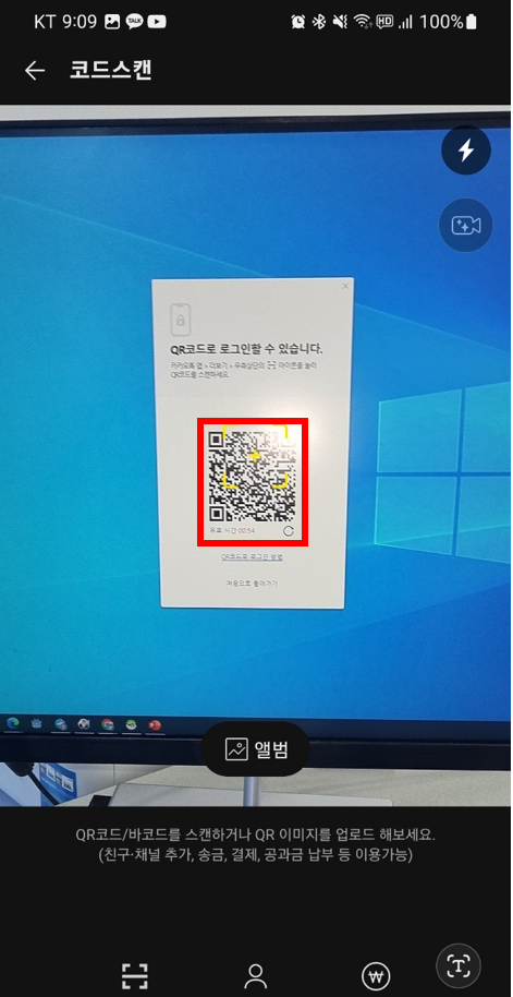 갑자기 카메라가 켜지는데요. 위 이미지처럼 윈도우에 QR코드 부분을 스마트폰으로 비춰주세요.