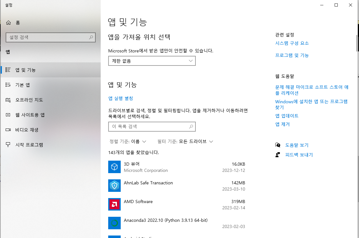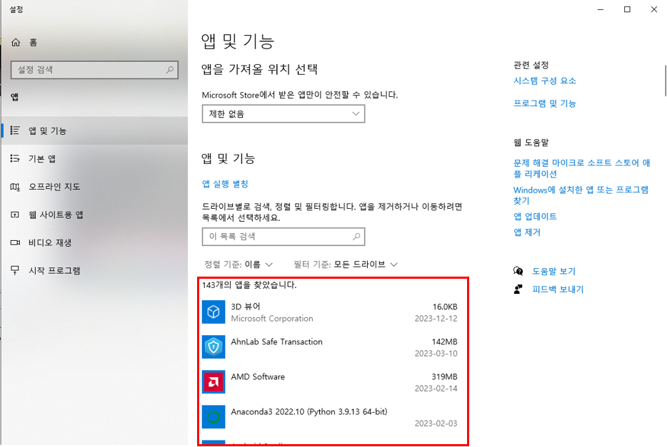 이곳에서 윈도우에 설치된 프로그램들을 확인해볼 수 있습니다.