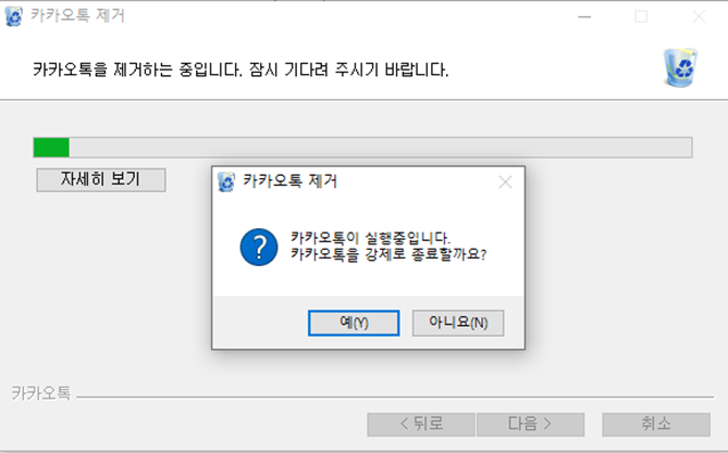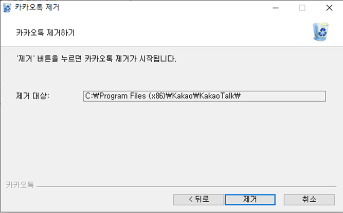 팝업에서 '제거'버튼이 추가로 표현되고 '제거'버튼을 클릭하시면 카카오톡 프로그램을 삭제를 시작하게 됩니다.