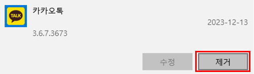 검색 된 '카카오톡' 항목을 선택하면 위 이미지처럼 제거버튼이 생성되는 걸 아실수 있는데요.